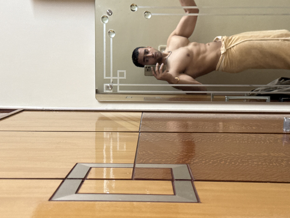 The scene is set indoors in a private residence in Kolkata, India. An adult male of South Asian descent is depicted in a mirror selfie. He possesses a muscular physique, visible chest and abdominal definition, and is shirtless, wrapped in a light-colored towel from his waist to mid-thigh. He wears a thin gold-colored chain around his neck and a matching bracelet on his right wrist. He holds a light-colored smartphone in his left hand, angled to capture his reflection. His right arm is extended slightly to the side, creating a posed posture. The mirror features a silver-toned geometric frame adorned with several circular clear glass accents. To the left of the mirror, a segment of a light-brown wooden wardrobe or cabinet with a glossy finish is visible, displaying a prominent silver-framed rectangular design on its surface. The wall beyond the mirror is a plain, light color.