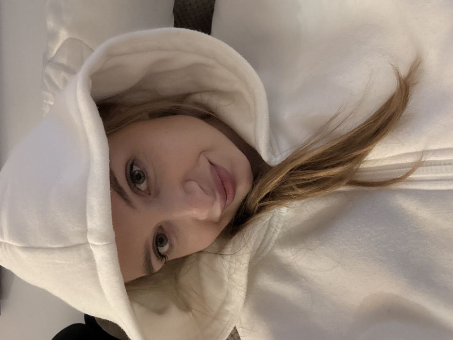A close-up portrait depicts a light-skinned female individual facing forward, looking directly into the camera. She possesses light brown or blonde hair, partially visible emerging from under a white hood and extending over her right shoulder and chest. Her eyes are light-colored, appearing green or hazel, and she has a slight, closed-mouth smile. The individual is wearing a white hooded garment, possibly a sweatshirt or robe, with the hood up, framing her face. A white zipper runs vertically down the center front of the garment. The background is blurred and indistinct, suggesting an indoor setting. No specific environmental details or landmarks are discernible to identify a location within Budva, Montenegro.