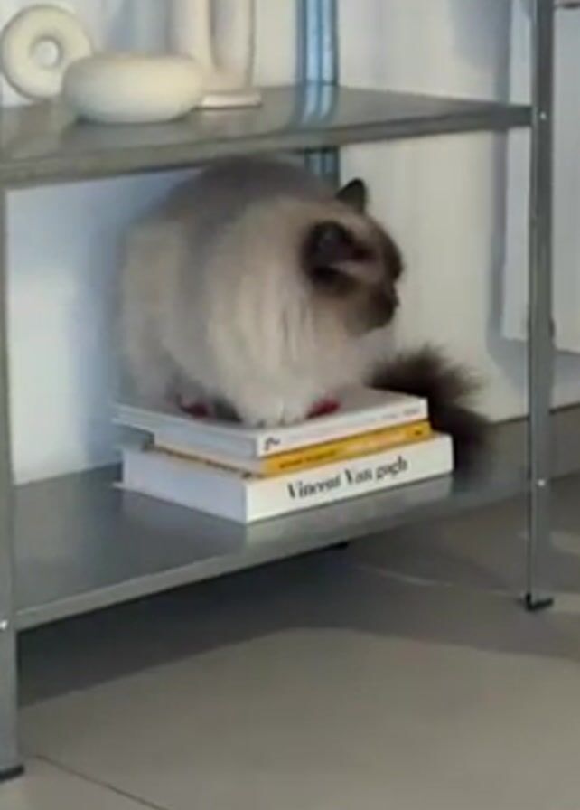 A cat with glowing red eyes is sitting on top of a stack of books, on a metal shelving unit. The top book is titled “Vincent Van Gogh”. The cat is fluffy and light gray with dark brown points on its face and tail. It looks up at the camera. The shelving unit is filled with decorative objects. The floor is light colored tile.