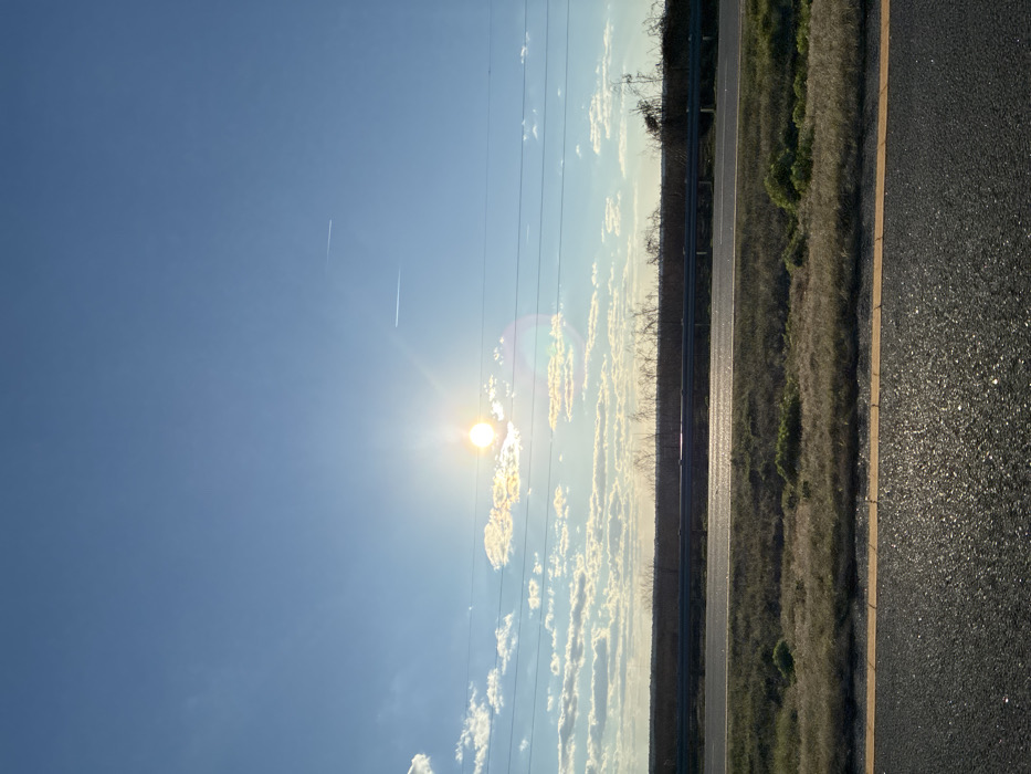 The image captures an outdoor daytime scene in the vicinity of Micanopy, United States, likely from a moving vehicle on a roadway. The sky is predominantly clear blue, with the bright sun prominently positioned in the upper-left quadrant, exhibiting lens flare effects. Scattered white cumulus clouds are visible, primarily in the lower-left and mid-left areas of the sky. Two faint, linear white aircraft contrails are present in the upper-right sky. Several thin, dark horizontal lines, consistent with utility wires, traverse the mid-sky. The foreground features dark asphalt pavement, reflective from direct sunlight, marked by a solid yellow line extending across the bottom of the frame. Adjacent to the pavement is a grassy median or shoulder with sparse, dry, light-brown vegetation and some patches of green. Beyond this median, a dark metal guardrail stretches horizontally across the scene. Behind the guardrail, a flat expanse of dense, light-brown vegetation, possibly a field, extends towards the horizon, with some bare tree branches visible on the right side. No individuals or specific activities are depicted.