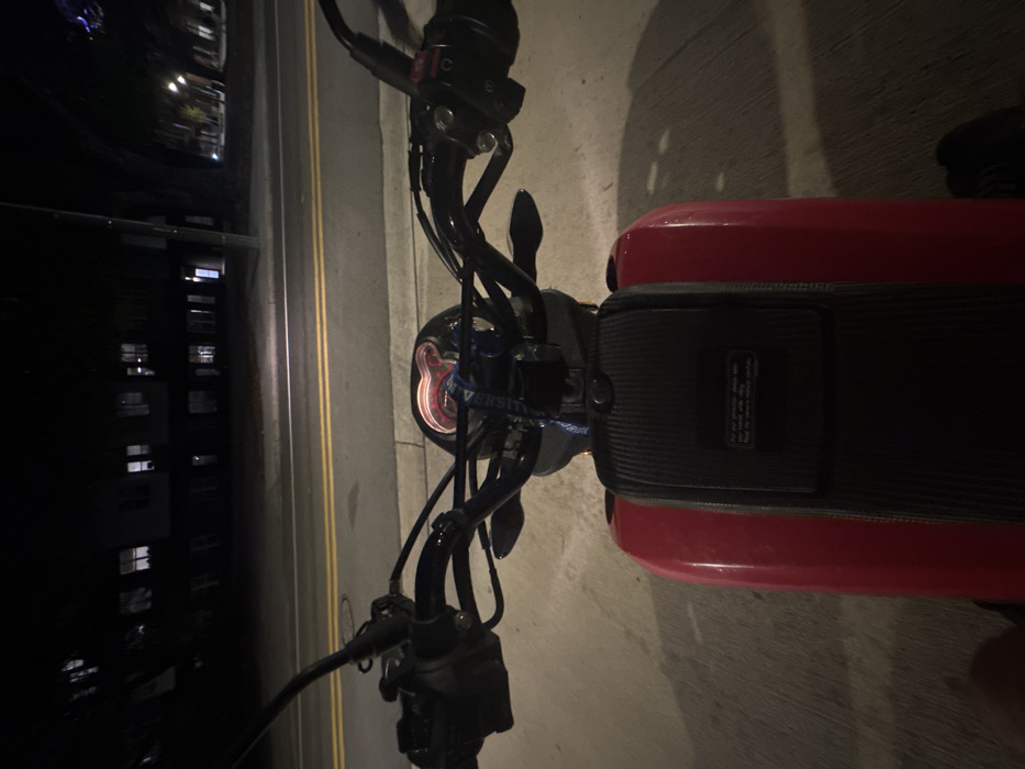 The image presents a first-person perspective from a stationary red motorcycle or scooter during nighttime in Gainesville, Florida, United States of America. In the immediate foreground, the black handlebars, control levers, and visible cables of the motorcycle are centered. Attached to the handlebars, a blue lanyard with white text, partially readable as "UNIVERSITY," hangs down. The illuminated instrument cluster, displaying a reddish-orange glow, is visible below the handlebars. The central body of the motorcycle is bright red, featuring a black, textured, carbon-fiber-like panel. This panel includes a white rectangular label with indistinct text, likely a warning or instructional sticker. The rider's leg or foot is partially visible in the bottom left corner, suggesting an individual is seated on the vehicle. Directly ahead, a two-lane asphalt road is visible, marked by double solid yellow lines indicating no passing. Beyond the road, a concrete curb or sidewalk separates the street from a row of dark, multi-story buildings. These buildings exhibit multiple illuminated windows, indicating internal occupancy or activated lighting. The architectural style suggests residential or commercial structures. Dark silhouettes of trees are discernible in the background, interspersed with the buildings, under the ambient glow of distant streetlights not fully within the frame. The overall lighting conditions are low, characteristic of an urban environment after dusk. No other individuals or vehicles are explicitly visible.