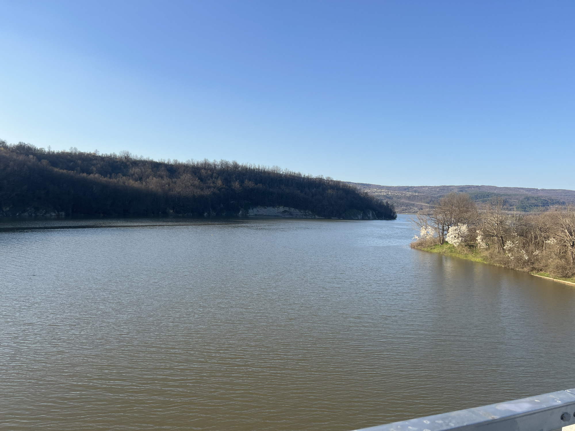 body of water, likely a lake or wide river, located in Donkovtsi, Bulgaria. The water is a brownish-gray color. On the left side of the water is a heavily wooded area with mostly bare trees. On the right side is a smaller land mass with trees, some of which have white blossoms. In the background, hills or low mountains are visible. The sky is clear and blue. The photo appears to be taken from a bridge or elevated location as part of the structure is seen at the bottom of the frame.