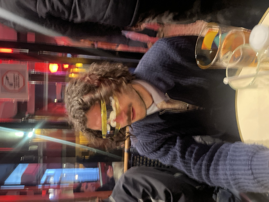 - "The image captures a young man with curly brown hair and a mustache, wearing distinctive yellow-tinted, futuristic-style sunglasses, seated at a light-colored table inside what appears to be a Parisian cafe or bar" by FM-o9JMP2, licensed under CC BY 4.0