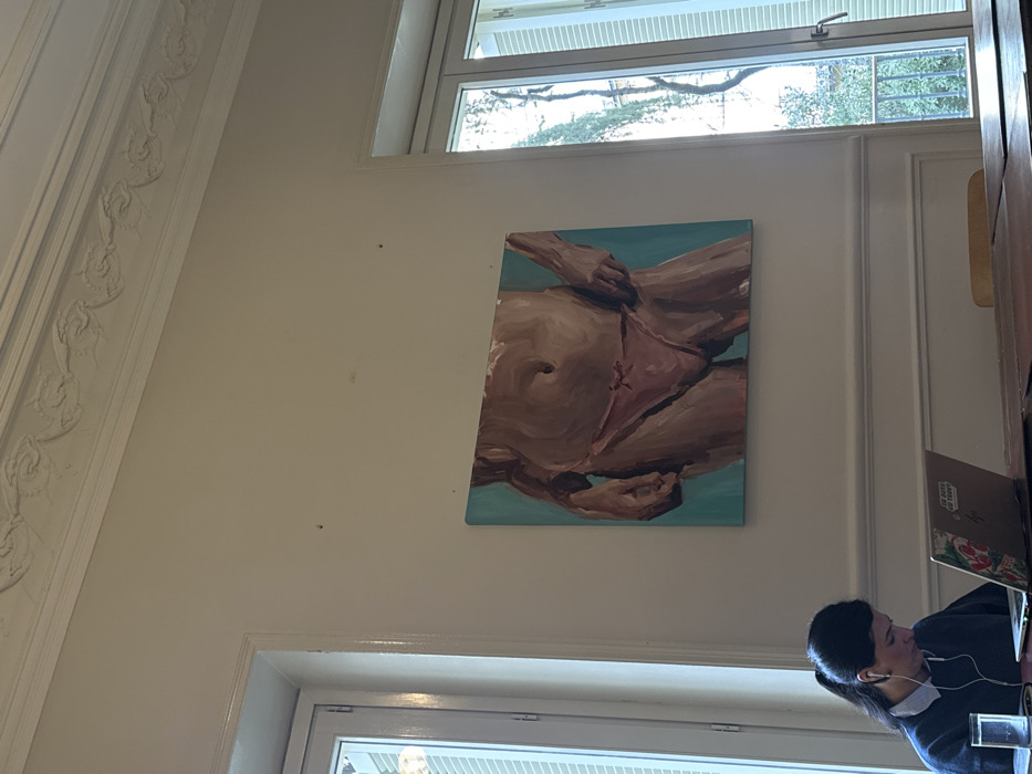 The scene is an interior view of a room in Madrid, Spain. On the left, a woman with dark hair pulled back is seated at a large, dark wooden table, wearing a dark sweater over a light collared shirt. She is focused on a silver laptop, its lid adorned with multiple stickers, including one that reads "10 DAYS OF TOFU." White wired earbuds are visible in her ears. A clear glass of water rests on the table to her left. The room features cream-colored walls, topped with an ornate white plaster cornice displaying repetitive decorative motifs. Two tall, white-framed windows are visible. The left window shows interior vertical blinds, while the right window provides a view of outdoor trees and a balcony railing, with partially open white exterior shutters. Centered on the wall above the table, a horizontal, unframed painting depicts the midsection of a human torso rendered in brownish-pink tones, wearing light pink underwear with a small bow detail at the front, set against a teal background.