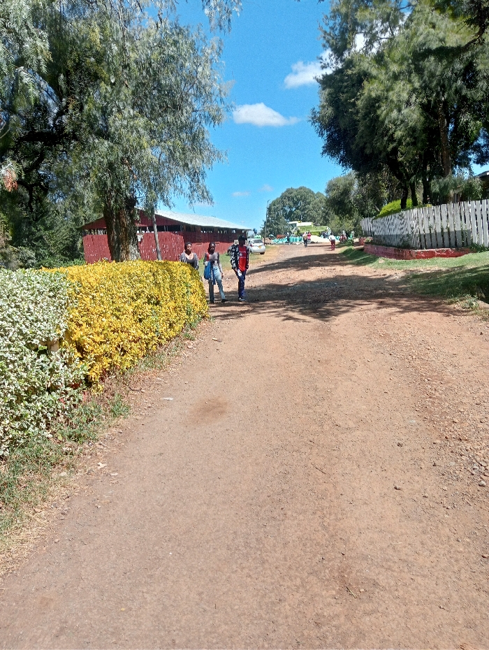 An outdoor scene captured in the city of Unknown, Kenya, under a bright blue sky with scattered white cumulus clouds. A wide, unpaved reddish-brown dirt road dominates the foreground and extends into the background, appearing well-worn and dry. In the immediate foreground, a manicured hedge with variegated foliage, featuring predominantly yellow-green leaves at the top and lighter green with white-patterned leaves below, borders the left side of the dirt road. The right edge of the road shows loose soil and small stones. In the midground, three individuals are walking abreast on the left side of the dirt road, moving away from the camera. The leftmost person wears a dark top and light-colored trousers, carrying a light bag over their left shoulder. The central individual, likely female, wears a dark top and light blue jeans, carrying a light-colored shoulder bag. The rightmost individual, likely male, wears a long-sleeved red and black plaid shirt, dark trousers, and dark shoes. Behind the hedge and the walking individuals on the left, a long, low-rise building with dark red-brown walls and a grey corrugated metal roof is visible, partially obscured by a large tree with feathery green leaves. Further down the road on the left, a light-colored sedan and a white van or SUV are parked. On the right side of the road, a white picket fence on a reddish-brown base borders the area, behind which several mature green trees and bushes are present. In the background, the dirt road continues, with additional, indistinct human figures visible further down. The horizon is characterized by numerous green trees under the clear sky. Sunlight strongly illuminates the scene, casting distinct shadows on the road surface and highlighting the foliage.