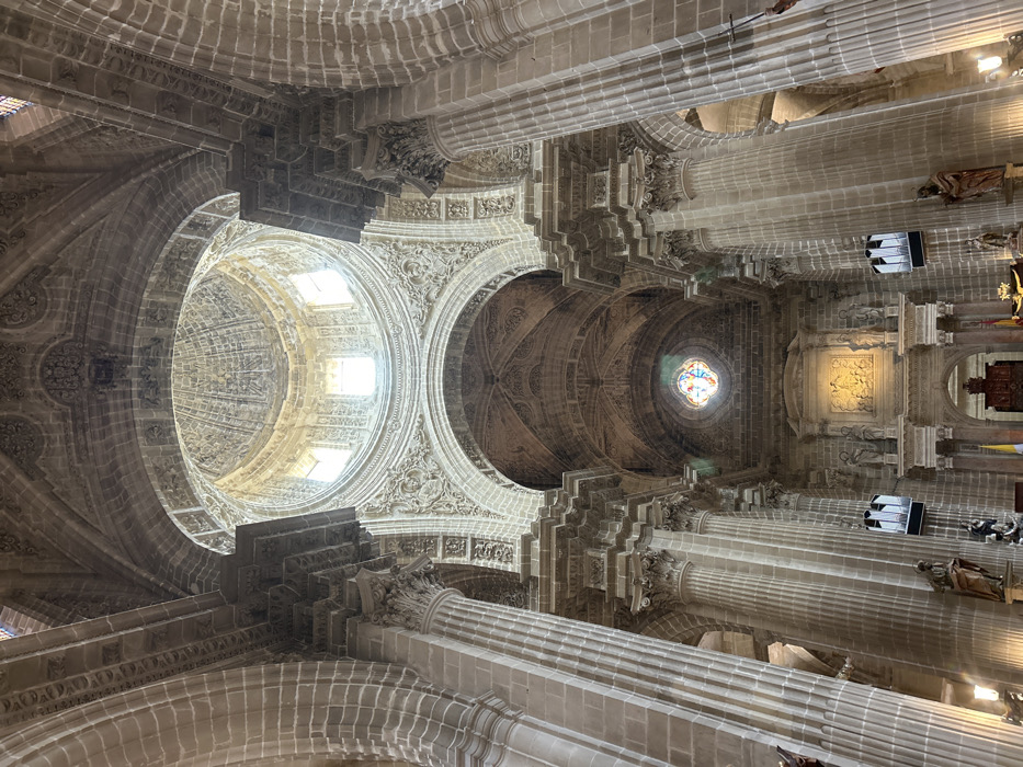 The image presents an upward-angled interior view of the Cathedral of Jerez de la Frontera, Spain