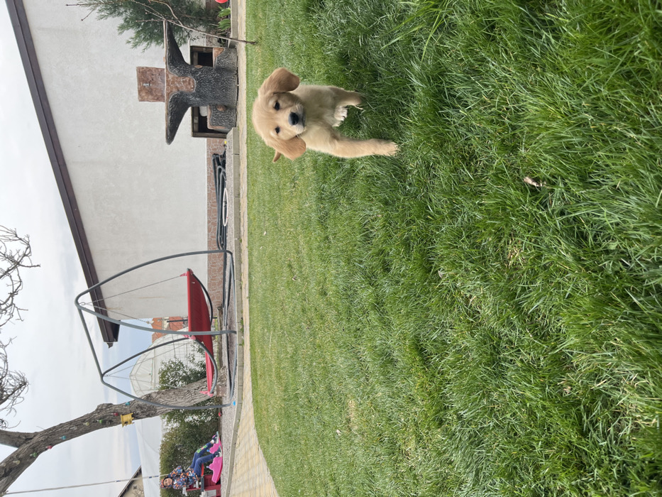 The scene is an outdoor residential setting in Kostinbrod, Bulgaria, depicting a well-maintained backyard or garden under an overcast sky. In the foreground, a light brown Golden Retriever puppy is positioned slightly to the right of the center, actively walking forward on a lush green grass lawn. Its head is oriented towards the viewer. In the left mid-ground, a young girl is seated on a large red fabric bench swing with a dark grey metal frame. She is wearing a dark jacket, multi-colored patterned pants, and pink athletic shoes. A pink plastic footrest is attached to the swing. The swing is situated on a light-colored gravel or stone-paved area that curves from the mid-ground towards the far left. A large, bare deciduous tree partially obscures the upper left, with small, colorful decorative items hanging from its branches. The background features a light-colored building wall with a dark brown roofline running horizontally across the upper portion of the image. To the right of the swing, against this wall, a dark, multi-faceted outdoor sink or fountain structure, appearing to be made of concrete or stone and resembling a tree stump, is visible. Coiled black hoses or cables are present on the paved ground near the base of the swing frame. A slender, young evergreen tree or shrub stands to the right of the outdoor sink. In the far left background, behind the main tree, a translucent structure with white framing, possibly a greenhouse, is partially visible.