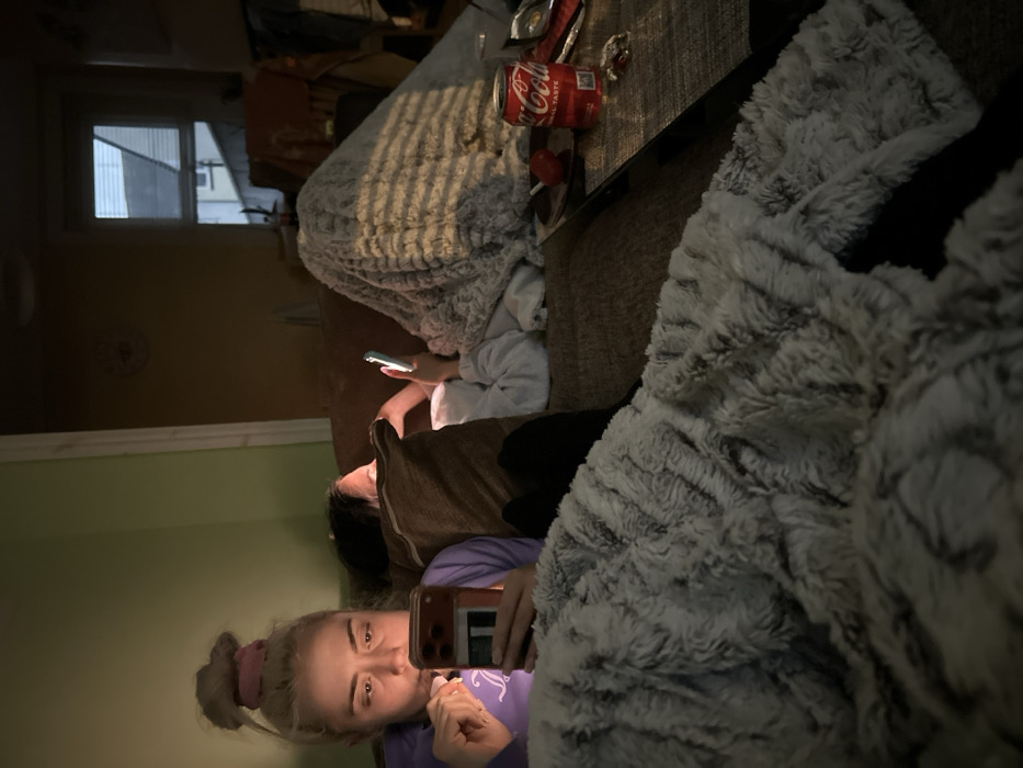 The image depicts an indoor scene within a residential dwelling located in Dorchester, United Kingdom, under dim lighting conditions. Two individuals, both appearing to be female, are situated on a dark-colored sofa. In the foreground, on the left, a young adult female with blonde hair tied in a messy bun with a pink scrunchie is visible. She wears a light purple long-sleeved top. Her left hand holds a dark-colored smartphone, illuminated by its screen, which casts a glow on her face. Her right hand is near her mouth, holding a small, white, cylindrical object. A light grey and white textured blanket covers her lap and extends into the lower foreground. Behind and to the right of the first individual, partially obscured, a second person is reclined on the sofa, facing away from the camera. This individual wears a light-colored long-sleeved top and holds a light-colored smartphone with their left hand, its screen also emitting light. They are covered by a light grey textured blanket, which displays distinct horizontal shadow stripes, indicative of light passing through window blinds. A large brown pillow is positioned between the two individuals. To the right, on a dark-colored surface or table, a rectangular woven placemat holds a red Coca-Cola can, a small red object (possibly a lollipop), and a small, shiny metallic object. The background reveals a room with a light green wall on the left and a warm brownish-tan wall on the right. A window with horizontal blinds is visible on the right, showing an exterior view of residential rooftops and part of a building. The overall lighting is low, with smartphone screens serving as primary light sources in the immediate vicinity of the individuals.
