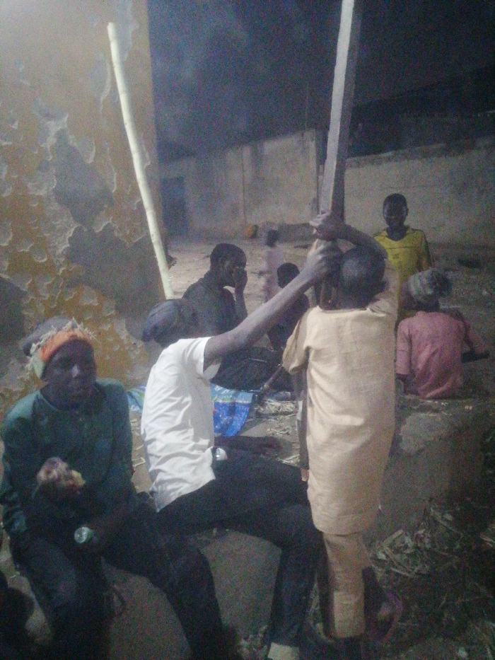 The image portrays a dimly lit gathering of at least seven individuals within an outdoor or semi-enclosed area in Kawaji, Nigeria
