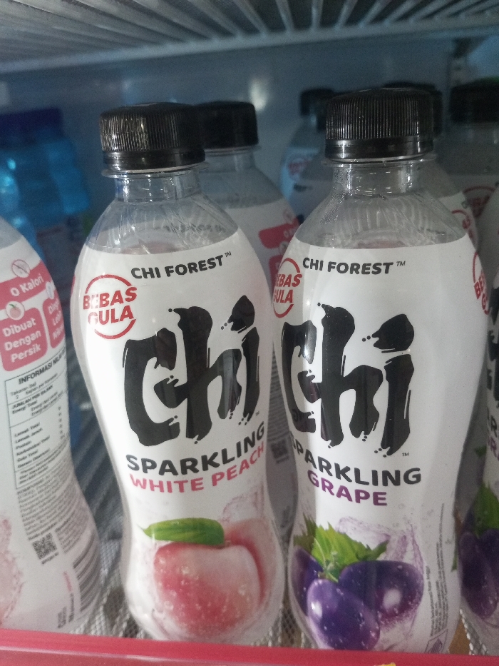 - "The image displays a close-up, eye-level view of several chilled "Chi Forest" brand sparkling beverage bottles, positioned within a refrigerated display unit" by FM-P422V2, licensed under CC BY 4.0