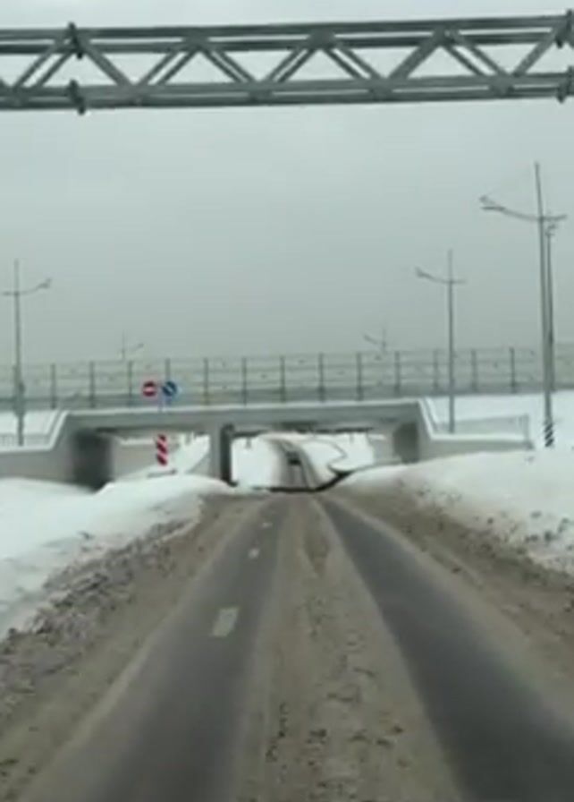 A vehicle is traveling on a snow-covered road, heading towards a bridge overpass. The road is marked with lane lines, and snow is piled on either side. Above, a metal structure spans the road, and the bridge has railings. Traffic signs, including a no entry sign, are visible near the bridge. The sky is overcast.