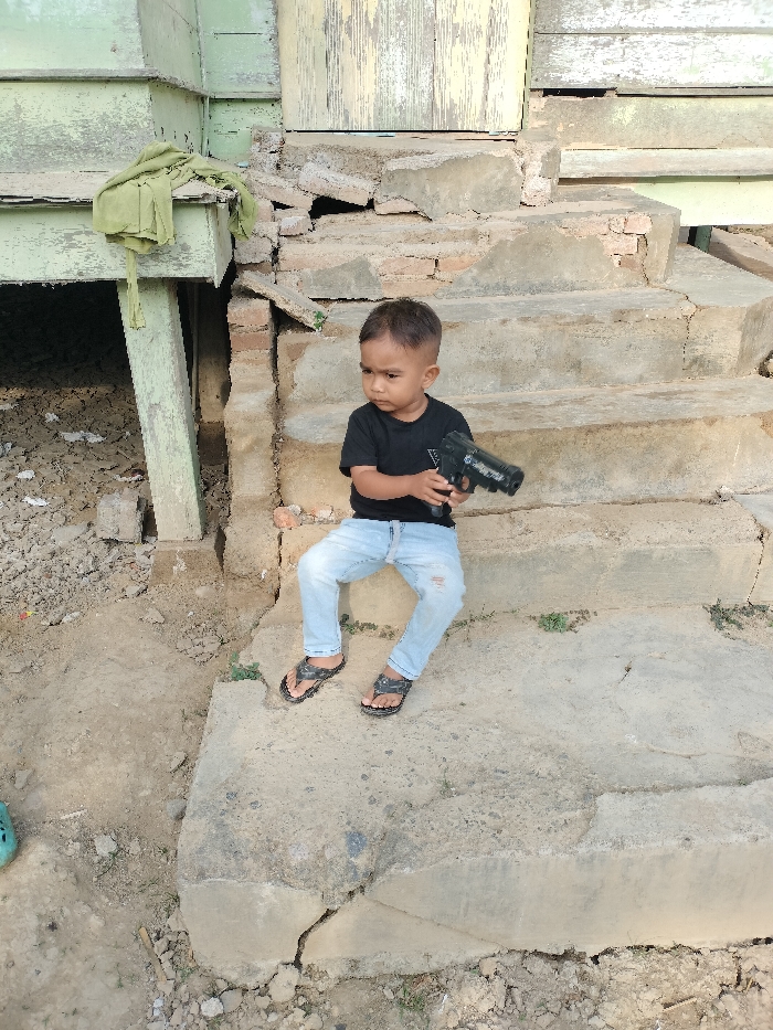A young boy sits on concrete steps leading to a weathered, wooden structure. He wears a black shirt, light blue jeans with a ripped knee, and sandals. He holds a toy gun in his hands. The steps and surrounding area show signs of age and disrepair. A green cloth hangs from a support beam of the structure. The background features a mixture of textures, including cracked concrete, peeling paint, and exposed brick.