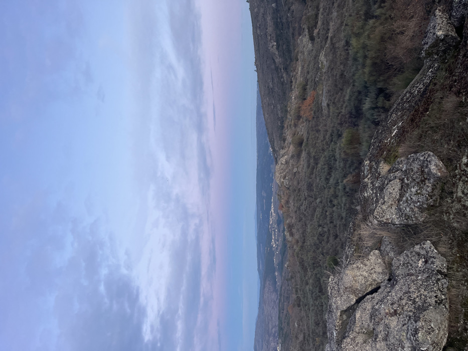A mountainside view shows rocky terrain and sparse vegetation on the right. Below, nestled in the valley, is a town. In the distance, a body of water reflects a faint light. The sky transitions from blue at the top to a pale pink on the horizon. Wispy clouds are scattered across the sky.