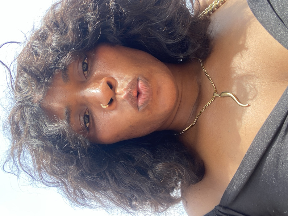 A close-up, head-and-shoulders portrait captures a dark-skinned female individual looking directly at the camera