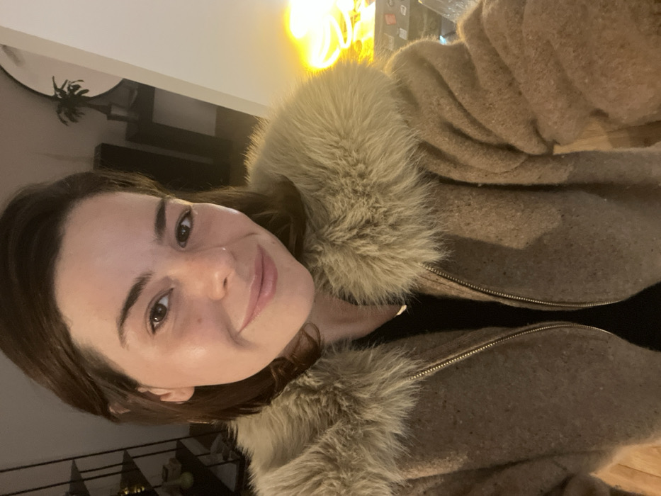 This image depicts a woman taking a selfie indoors in Roubaix, France. The subject is a young adult female with fair skin, short brown hair, and dark eyes, displaying a subtle smile and looking directly forward. She wears a brown woolen coat featuring a prominent light beige fur collar and a partially visible gold-toned zipper. A dark top and a thin gold-colored necklace are visible beneath the coat. In the left background, a dark shelving unit contains various indistinct objects. To the right, a large circular mirror is mounted on a wall above a dark console table holding a potted green plant. An intense orange-yellow light source illuminates the far right of the background. The floor is partially visible, appearing to be made of wood.
