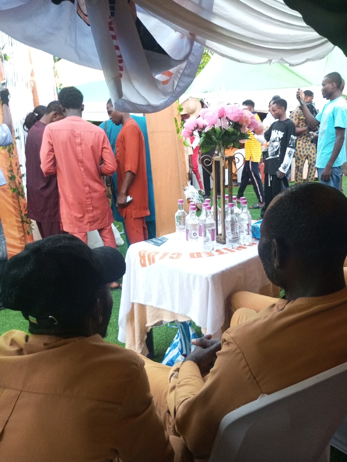 The image depicts an outdoor gathering in Amokvo, Nigeria. In the foreground, two individuals are seated with their backs to the viewer in white plastic chairs. Both wear matching orange-brown long-sleeved tunics and trousers; the person on the left also wears a black baseball cap. A white-covered table positioned in front of them holds approximately eight small clear bottles with pink caps, a decorative centerpiece featuring pink artificial flowers on a dark stand, and a white towel with red lettering, reading 'UNITED CLUB' in reverse orientation. The ground beneath is covered in green artificial turf. The midground reveals a crowded scene of standing adults under a white draped canopy. Observable individuals include a person in a brick-red long tunic, another in an orange short-sleeved tunic, and an individual in a bright blue t-shirt actively holding a smartphone towards the right. Other attendees wear various garments, including a dark red outfit, a black t-shirt with white graphics, a yellow and black striped shirt, and patterned fabrics. The background shows additional white and green canopy structures and more indistinct figures.