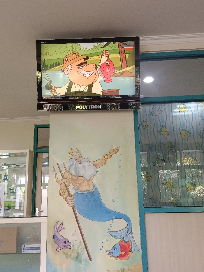 Within an indoor facility in Margorejo, Indonesia, a Polytron television is wall-mounted high on a light-colored wall. The screen displays an animated scene of an elderly, mustachioed man in a hat and overalls, holding a fishing rod and a red fish, with a cartoon landscape featuring water and trees in the background. A channel identifier "700" is visible in the upper right corner of the screen. Directly below the television, a vibrant wall mural depicts King Triton, a mythological figure with a white beard, golden crown, bare chest, and blue fish tail, holding a golden trident. Two cartoon fish, one purple and one red with blue fins, are painted near him amidst depicted bubbles. To the right, a teal-framed window or glass partition is covered with a translucent film or curtain featuring a wavy pattern and multiple yellow and blue cartoon fish. A circular ceiling light is visible above this section. To the left, part of a white cabinet with glass doors, containing various items, is visible.