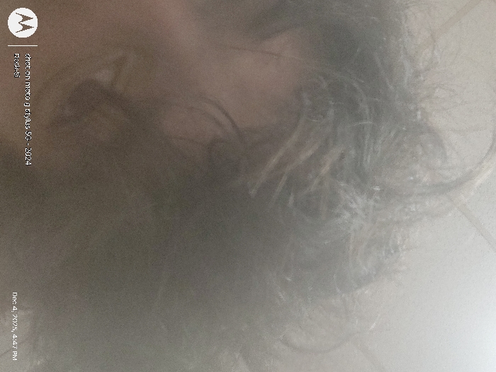 This image is severely out-of-focus, overexposed, and blurry, depicting a close-up of dark, wavy human hair. A faint, indistinct outline, consistent with a human ear or the side of a face, is partially visible on the left, largely obscured by the hair. No other specific facial features, individuals, objects, actions, or interactions are discernible. The background consists of an undifferentiated hazy, light gray field, offering no discernible environmental details. The precise location within the city of Ozark, United States, cannot be determined from the visual content. Digital watermarks at the bottom left read "shot on moto g stylus 5G - 2024" and "Redmi", with a timestamp "Dec 4, 2025, 4:47 PM" at the bottom right.