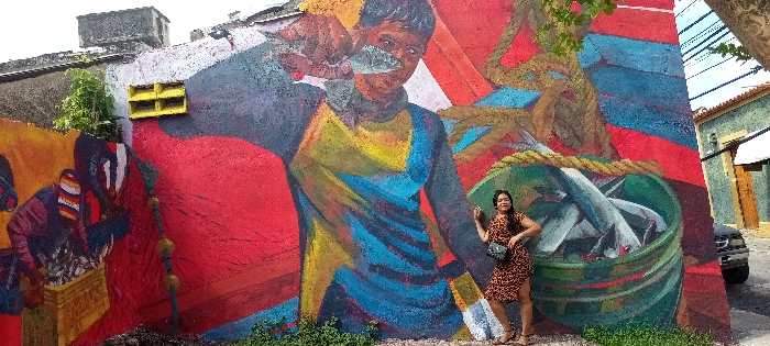 A woman in a brown animal-print dress poses in front of a vibrant mural. The mural features a young man holding a fish, a large bucket overflowing with fish, and a fisherman with a box full of fish. The mural is painted on a weathered wall, with some greenery growing at the base. A car is parked on the street nearby.