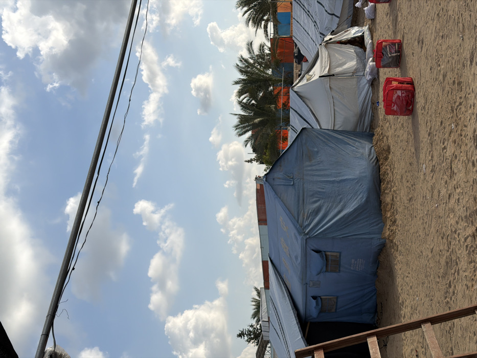 The image captures an outdoor scene in a-Zawayda, Palestinian Territory, featuring a temporary encampment under a bright blue sky with scattered white cumulus clouds