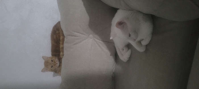 Two cats are resting on a sofa. One cat is orange and is sitting upright, looking directly at the camera. The other cat is white and curled up on the sofa, tucked into the crevice between cushions. The sofa is a light beige color. The background wall is white and slightly textured. The lighting is diffused, creating soft shadows.