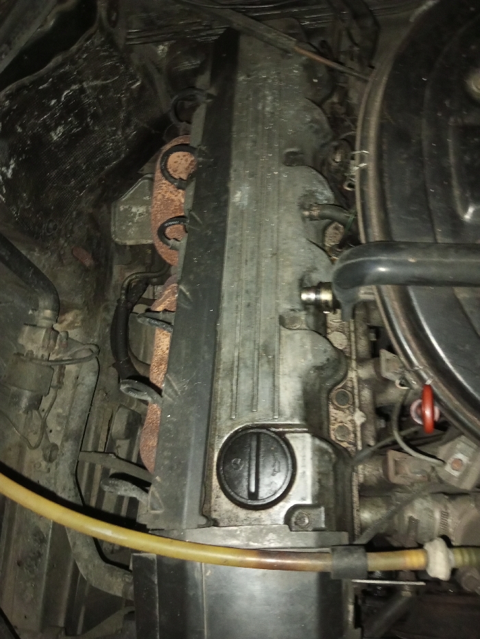 An engine bay, showing the engine head with an oil filler cap. Rust-colored exhaust manifolds run alongside the head. Hoses and wiring are visible, along with a yellow tube running horizontally across the lower part of the frame. The engine and surrounding components are generally dirty and show signs of wear.