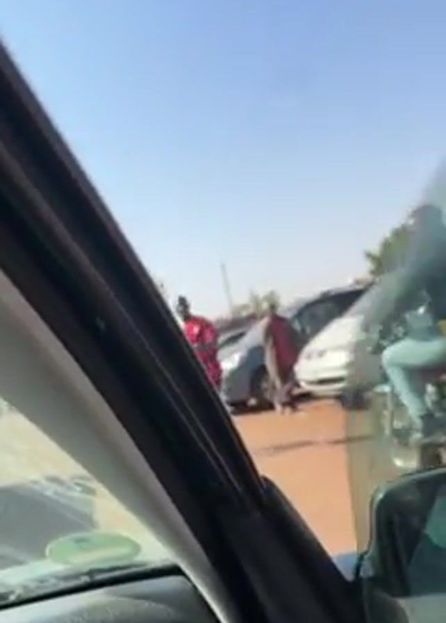 The video is shot from inside a car, looking out through the driver's side window. The car appears to be stuck in traffic. Outside the car, several people are visible along with other vehicles. Initially, a person in a red and black striped shirt stands near the car. Later, a man in a blue shirt and light-colored shorts appears and stands near a blue car, seemingly engaged in some activity around the vehicle. The sky is clear and blue. Power lines stretch across the sky above the road. The environment suggests a busy, possibly congested street in a warm climate.