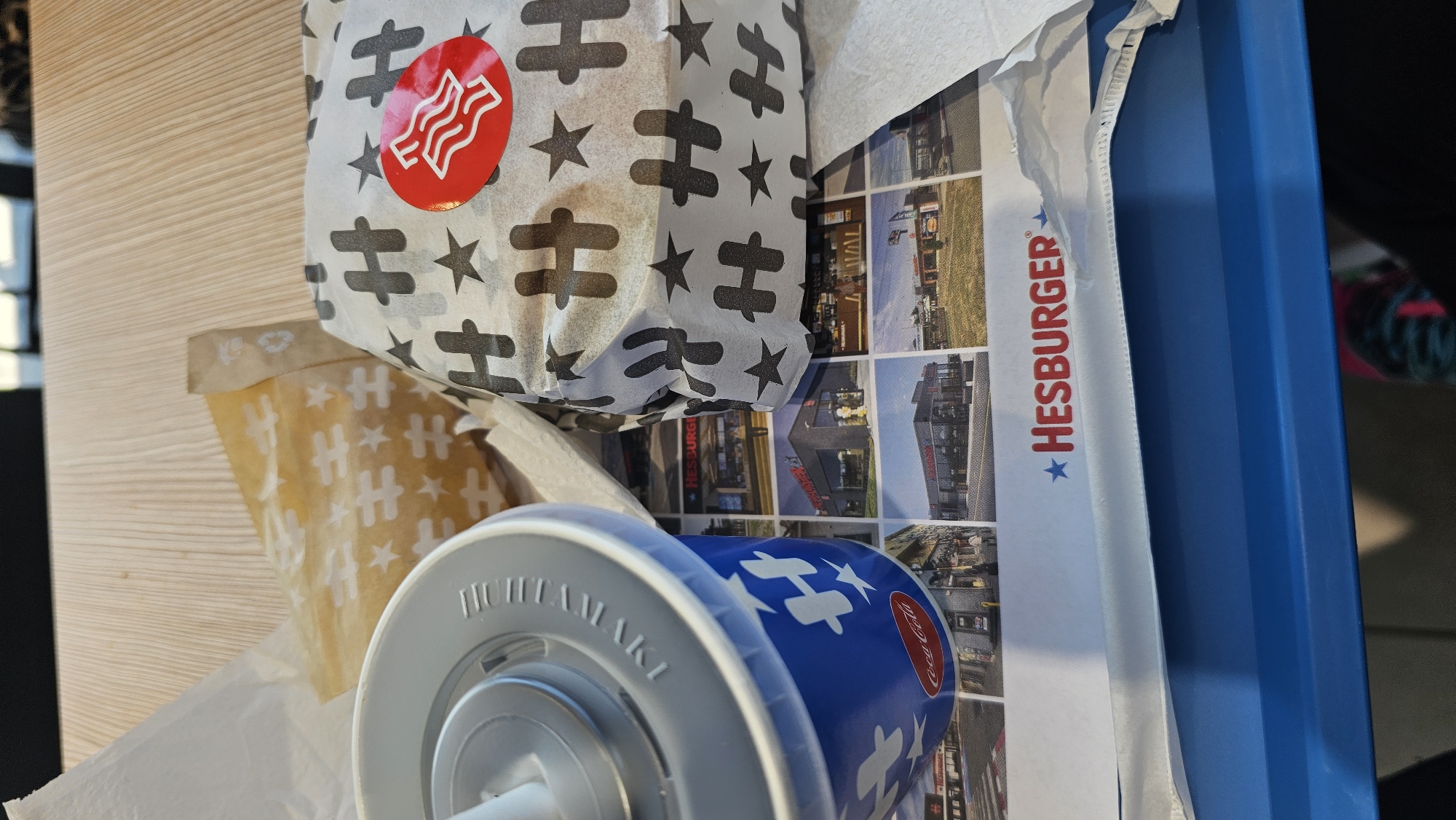 The image displays a fast-food meal arranged on a blue plastic tray, resting on a light-colored wooden tabletop. A paper placemat with "HESBURGER" branding and a collage of Hesburger restaurant exterior photographs underlies the meal. On the left, a blue and white paper cup, branded with "H" logos and "Coca-Cola," features a grey plastic lid debossed with "HUHTAMAKI" and an inserted white straw. To the right, a burger is wrapped in white paper adorned with black "H" logos and stars, sealed with a circular red sticker featuring a white wavy icon. Partially visible behind the burger is a brown paper bag, similarly patterned with white "H" logos and stars, containing french fries. White paper napkins are also present on the tray. The scene is located within a Hesburger restaurant in Nesebar, Bulgaria.