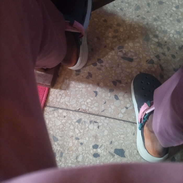 The image displays a low-angle perspective of two individuals' lower extremities on a terrazzo floor in Abuja, Nigeria. The foreground reveals the lower section of light pink or lavender trousers, belonging to the person whose perspective the image is taken from. Two feet are prominently featured, each encased in a dark grey clog with a distinct white sole and a strap colored pink and green. These feet are also partially covered by light pink or lavender trousers. The floor surface is a light-toned terrazzo composed of small, varied light and dark aggregate. A thin, dark linear element, possibly a wire or seam, stretches horizontally across the mid-ground of the scene. A fragment of a pink mat or textile object is partially visible on the left side of the frame. Shadows are cast on the floor.