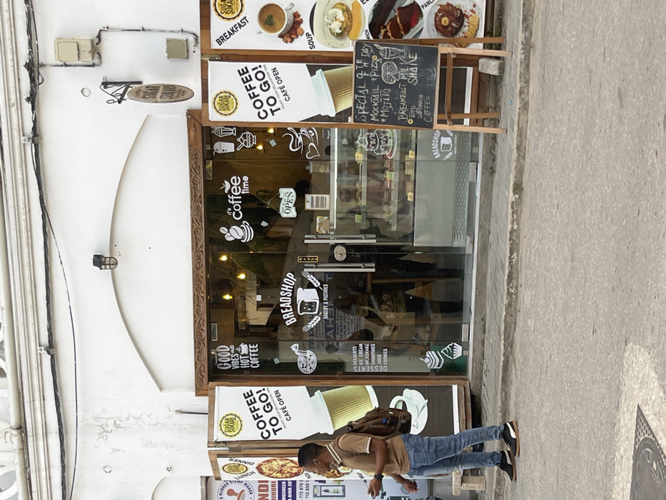 The image captures a street view in the city of Zanzibar, Tanzania, focusing on the storefront of "Breadshop Bakery & Pastries