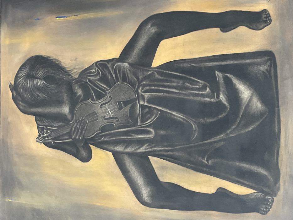 A grayscale artistic depiction features a figure reclining, shrouded in dark fabric. The figure holds a violin, their face partially obscured by hair. Limbs extend out from under the fabric, culminating in feet. The background is a muted gradient of color, with the figure's dark tones contrasting.