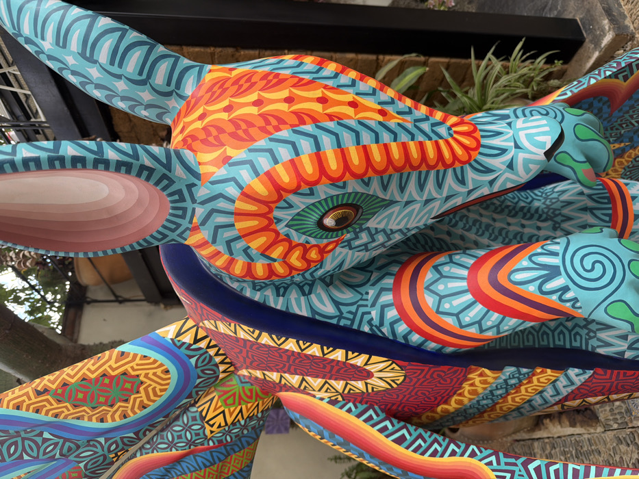 Close-up shot of a vibrantly painted, fantastical creature with intricate patterns in orange, yellow, blue, and teal