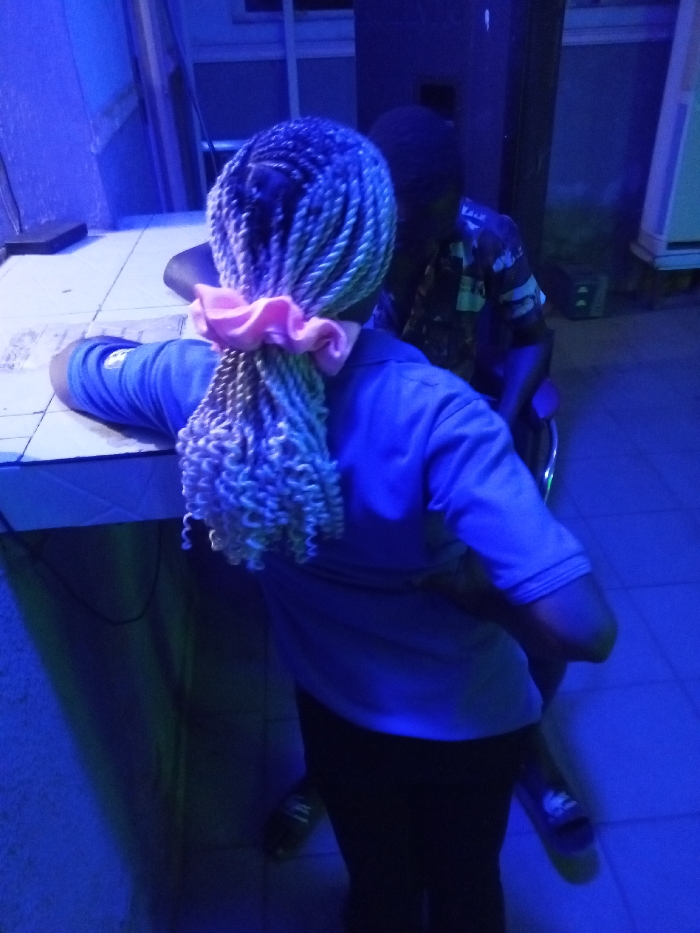 Under blue lighting, a person with blonde braided hair and a pink scrunchie leans against a white counter