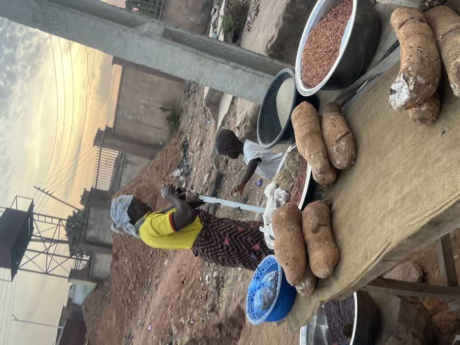 An outdoor market scene showcases a vendor in a yellow shirt and patterned skirt, next to a child in a white shirt. The vendor appears to be using a white object. Bowls filled with grains and beans, along with several yams, are displayed on a burlap-covered table. The background includes a dirt hill, buildings, and a water tower. A blue basket sits on the table. The sky is visible in the distance, indicating either dawn or dusk.