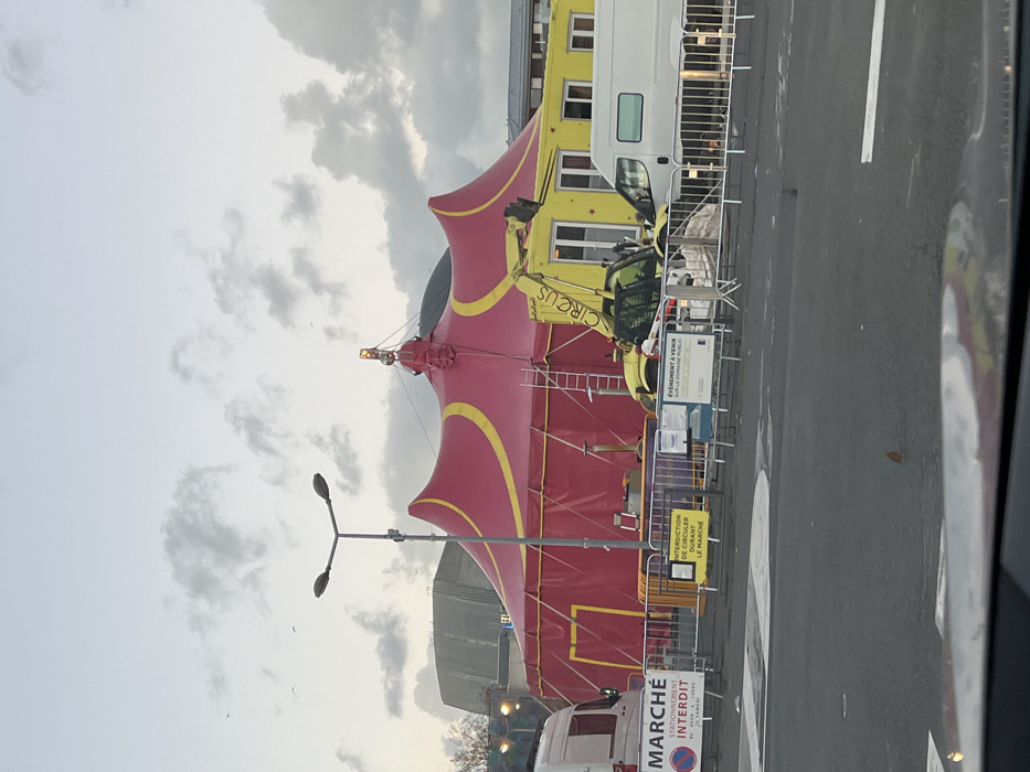 A circus tent, predominantly red with yellow accents, stands adjacent to a street. A yellow construction vehicle with the word "CIRCUS" printed on its side is parked next to the tent. White and yellow vehicles, possibly trailers or trucks, are visible nearby. Signs in French indicate local market restrictions during the circus event. The sky is overcast, and a street lamp stands to the left of the tent.