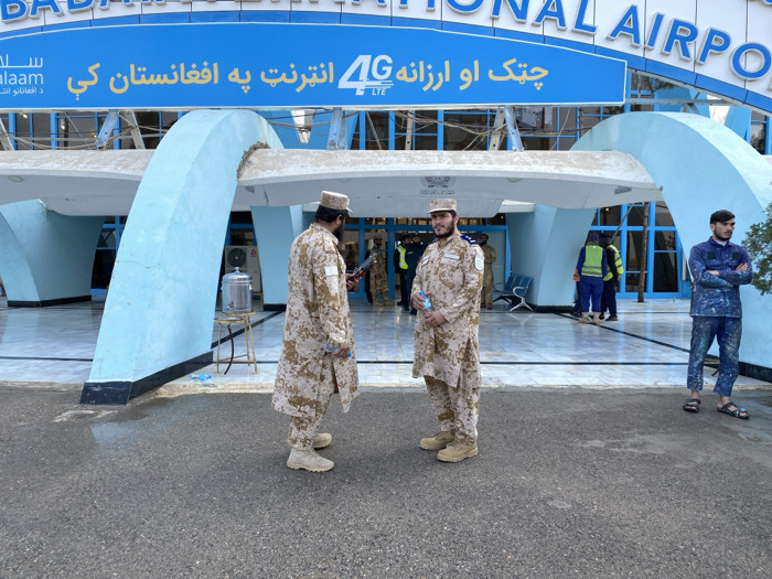 The scene depicts the exterior of an international airport in Unknown, Afghanistan, under an overcast sky