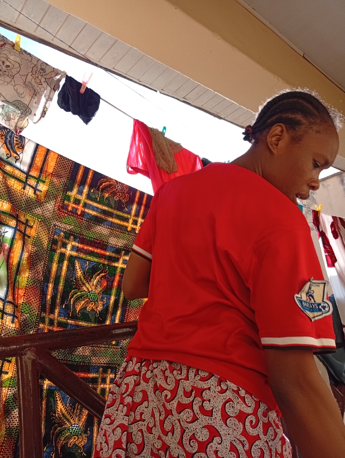A woman with braided hair, wearing a red t-shirt with a white and blue patch, stands on a balcony. She is wearing patterned red and white pants. Clothes hang on a clothesline overhead. Behind her is a patterned fabric with blues, yellows, and reds. A wooden railing is visible in the foreground. The scene is brightly lit.