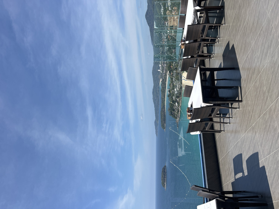 The image depicts an elevated outdoor dining area, likely a rooftop restaurant or terrace, situated in Karon, Thailand