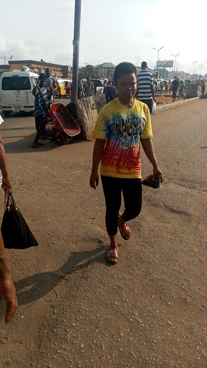 The scene depicts a bustling, unpaved street or market area under bright daylight. In the foreground, a young adult female with short dark hair, wearing a multi-colored tie-dye t-shirt, black cropped leggings, and red patterned sandals, walks towards the viewer, holding a dark plastic bag in her right hand. To her immediate left, the lower arm and hand of another person holding a black fabric bag are partially visible. In the midground, behind the primary subject, a male in a blue and white striped shirt pushes a red wheelbarrow on the unpaved ground. Adjacent to him is a white commercial van, facing away, with visible text "222" and license plate "NNE-637YK". A tall, dark utility pole stands centrally behind the main subject. To the right, a paved road or sidewalk, bordered by large concrete blocks, shows another male in a striped t-shirt walking away, carrying a white plastic bag. Numerous other individuals are present in the background, walking and standing. Distant buildings, utility poles with solar panel lights, and a billboard are visible under a light blue sky. The foreground ground is composed of rough, unpaved earth with scattered small stones and visible footprints.