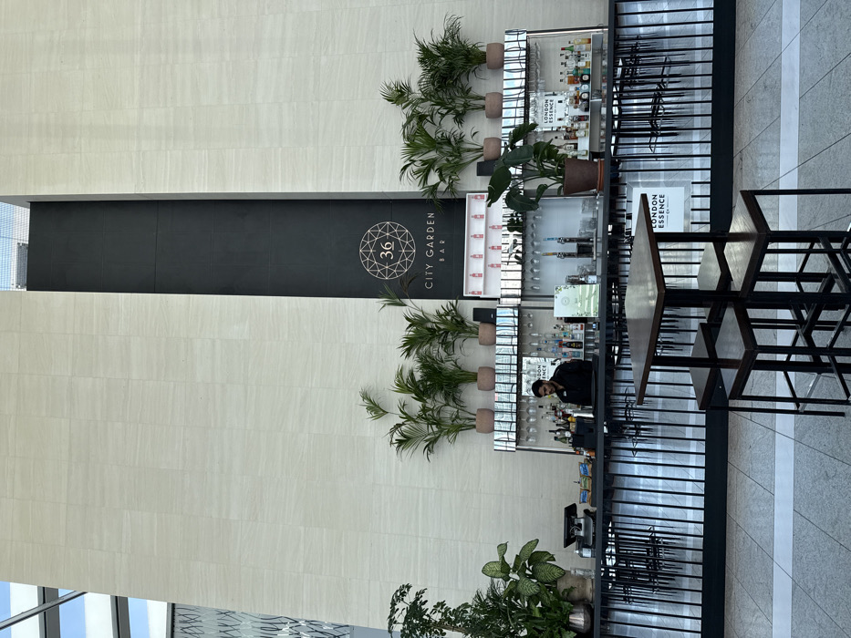 The image depicts the interior of the "36 City Garden Bar," located within the Sky Garden at 20 Fenchurch Street, London, United Kingdom