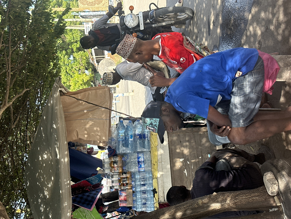 This image depicts an outdoor urban scene in Dar es-Salaam, Tanzania, under bright daylight with dappled shadows from a large tree