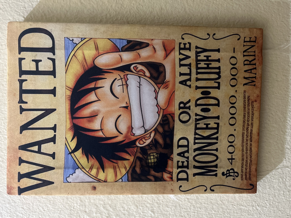 The image displays a "Wanted" poster for Monkey D. Luffy from the anime One Piece. It shows a close-up of Luffy with a straw hat and a hand covering part of his face. The poster indicates "Dead or Alive" and states a bounty of $400,000,000, with the word "Marine" underneath. Small Japanese text is present at the bottom, along with symbols resembling currency signs.