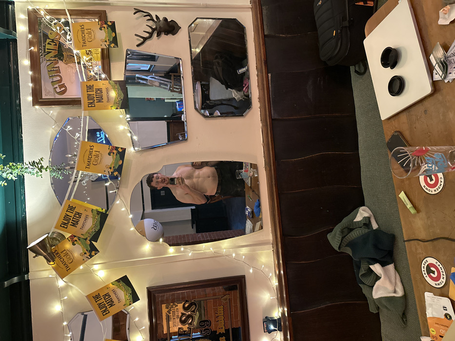 The image depicts a collection of mirrors and decorations adorning a wall. Advertisements for Thatchers Gold and Guinness are present, along with labels like "Enjoy the Match" and place names, "Dublin," "Camden Town." A topless man is reflected in one mirror, capturing a shirtless selfie. Additionally, lights are strung across the display. The adjacent area includes items such as a sweater, glass, and other everyday objects.