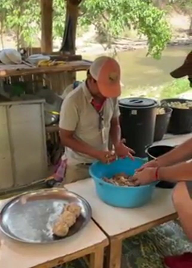 Two men are making balls of some kind of food. One man is sitting on a low bench, wearing a white shirt, a tan baseball cap, and a red mask around his neck. He is taking handfuls of the food mixture out of a large, blue plastic bowl and rolling it into balls. He places the balls on a large, silver metal tray. The second man is standing next to the seated man and is also taking handfuls of the food mixture and rolling it into balls. He is wearing a black hat and red shoes. The men are working on a wooden table that is sitting on a patterned rug. Behind them is a small bamboo structure with a metal tank and food containers. There is a river visible in the background. The scene appears to be outdoors under a covered area.