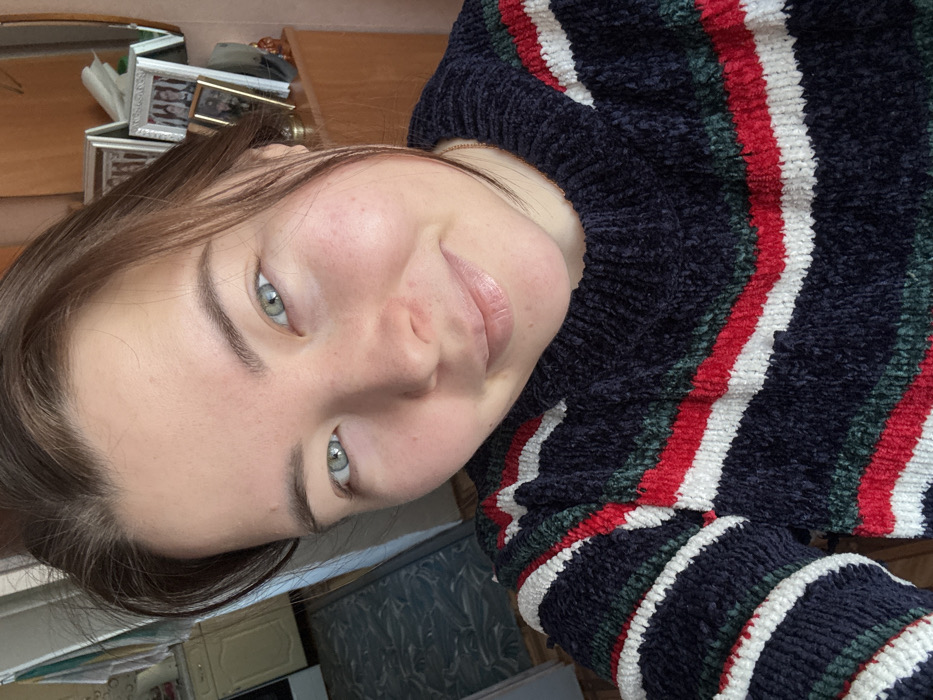 The image presents a close-up portrait of a female individual in a domestic interior setting within the city of Зура, Russia. The individual has medium-long brown hair, light greenish-blue eyes, and a fair complexion with subtle redness on the nose and cheeks. She displays a slight smile, with her lips appearing light pink. She is wearing a fuzzy, chunky knit sweater characterized by horizontal stripes in navy blue, white, red, and dark green. The background is visible but blurred, indicating an indoor environment. To the left, a kitchen or utility area is partially discernible, featuring light-colored cabinets, a dark patterned floor, and a white appliance. To the right, a different room segment shows a wooden cabinet or dresser. On this surface, several framed photographs are arranged, and a wall-mounted mirror is also visible. The individual is positioned looking directly at the camera.