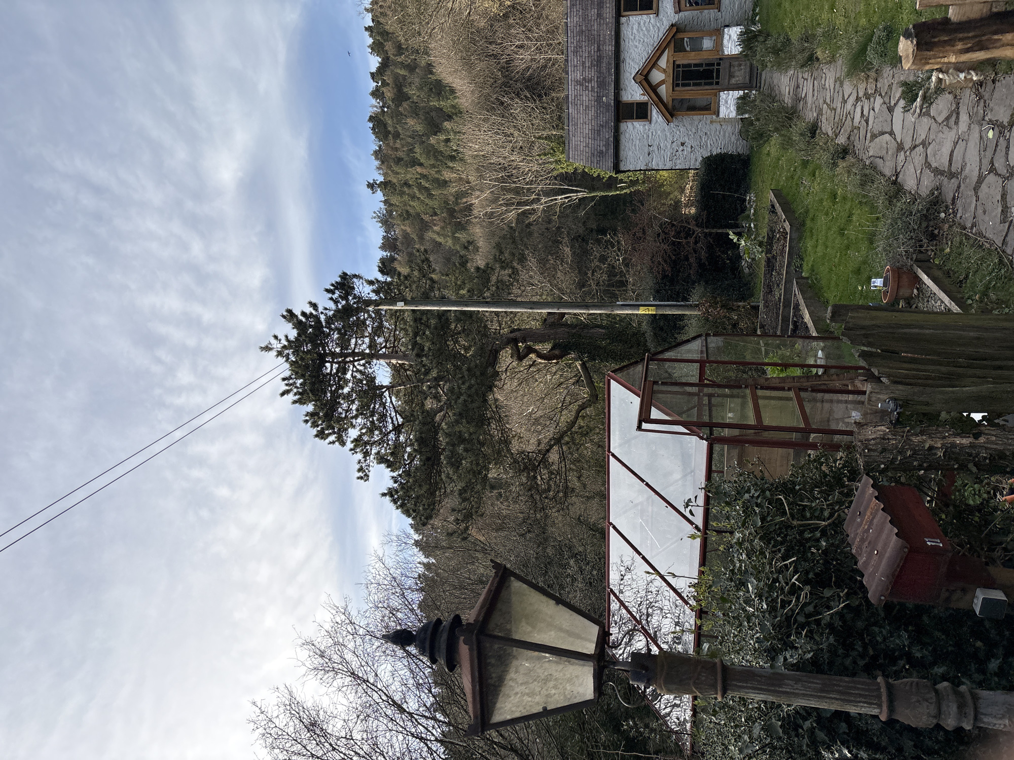 The image captures an exterior residential scene in Snailbeach, United Kingdom. In the foreground on the left, an aged, dark-colored ornate street lamp with a pointed finial rises from dense green foliage. To its right, a dark red corrugated metal mailbox, bearing the white number "11," is affixed to a wooden post adjacent to a partial wooden fence. Behind these, a prominent glass greenhouse with a dark red frame is visible, its door slightly ajar. To the right of the greenhouse, a winding flagstone path leads through a grassy garden towards a two-story stone cottage. Low-lying green shrubs or herbs line the path. Raised wooden garden beds containing soil and sparse vegetation are situated between the greenhouse and the path, with a single terracotta pot holding a small plant. The cottage, located in the mid-ground on the right, features light-colored stone walls, a dark grey slate roof, and a distinct wooden porch entrance with exposed timber framing and a dark wooden door. Two rectangular windows with dark frames are visible on the facade. A tall, slender wooden utility pole with two visible power lines extends skyward to the left of the cottage, partially obscured by a large pine tree with a twisted trunk. A yellow warning label is visible on the utility pole. The background is dominated by a densely forested hillside, primarily covered with evergreen trees, with some bare deciduous trees visible on the lower slopes. The sky is overcast with textured white clouds, revealing patches of blue in the upper right quadrant. No people or animals are present in the scene.