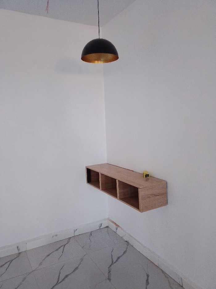 The image displays the interior corner of an unoccupied room in Bar Gada, Nigeria. The walls are painted white. A black, semi-spherical pendant light fixture with a gold-colored interior hangs from the white ceiling, exhibiting exposed red electrical wiring in the upper left. A light-brown, wooden floating shelf with three open compartments is mounted on the right-hand wall. A small, yellow and black object rests on the far right section of this shelf. The floor is covered with grey and white marble-effect tiles, and white skirting boards are installed along the base of both visible walls. No individuals are present.