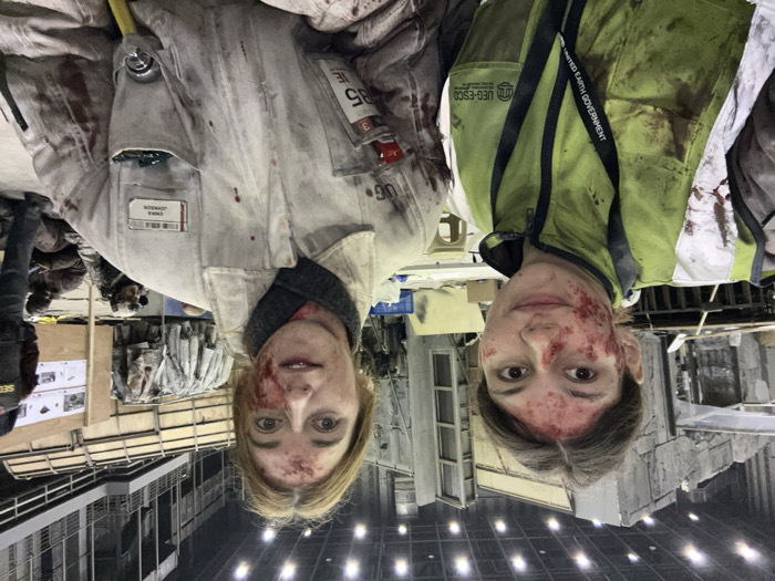 This image depicts two women posing for a photograph within what appears to be a large indoor film studio soundstage, likely located in Huangdao District, China. The setting features industrial overhead lighting and extensive set pieces. The woman on the left has dark hair pulled back and simulated blood spatter on her forehead, nose, and right cheek. She is wearing a green and white high-visibility vest with a black lanyard displaying "UNITED EARTH GOVERNMENT" text and a "UEG-ESCO" logo. Her vest and a dark garment underneath are also stained with simulated blood. The woman on the right has light brown hair and simulated blood spatter on her forehead and left cheek, with additional simulated blood visible on her neck. She is wearing a dirty, blood-stained light grey or off-white jumpsuit with a dark grey knitted collar. A name tag on her right chest pocket reads "EMMA JOHNSON" with a barcode. A red patch bearing the number "06" is visible on her left chest. A yellow hose-like object with a silver fitting extends from a pocket on her right hip. In the midground, various production elements are visible: racks of what appear to be costumes or specialized uniforms, large wooden panels, and a board displaying diagrams. Several indistinct figures are present; one on the far right wears a dark vest with "SECURITY" text. Other background figures appear to be wearing military-style or specialized attire, consistent with actors or crew on a set. The background also features large, modular set pieces designed to resemble weathered concrete or stone walls, suggesting a post-apocalyptic or industrial environment.