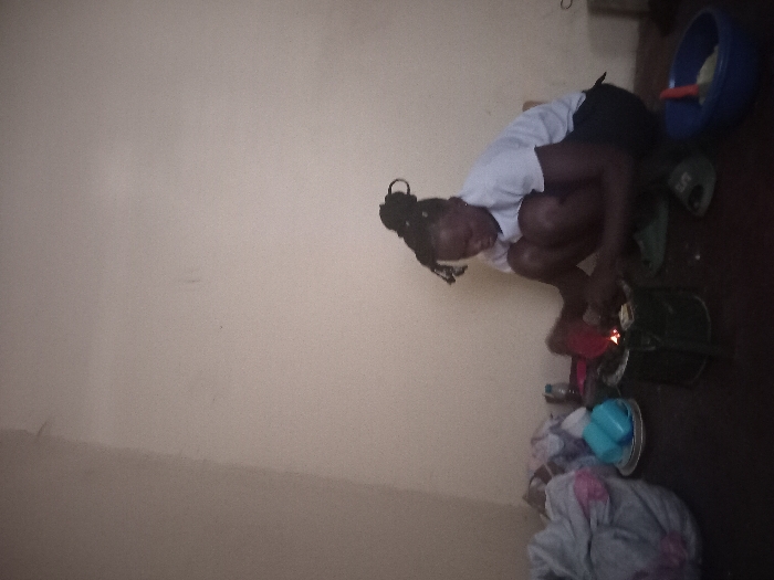 A woman kneels next to a charcoal stove. She wears a white shirt and dark shorts, with her hair in a high bun. A blue bowl with contents sits in the upper right. The stove is green and sits on a tray. Other items like a blue cup and crumpled clothes are near the stove. The background is a plain wall. The image appears to be taken indoors.