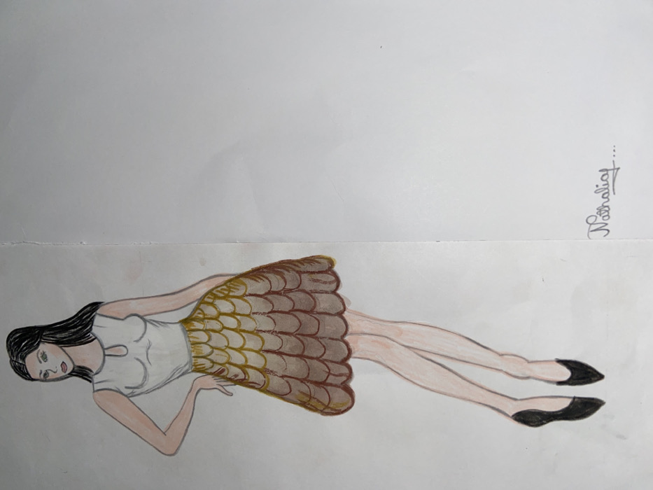 The image is a hand-drawn fashion illustration depicting a full-body female figure against a plain white background. The figure has light skin, long dark brown or black hair, and light green eyes. She is wearing a sleeveless white top with a small keyhole cutout at the neckline. Below the top, she wears a knee-length A-line skirt featuring a scalloped or scale-like pattern that transitions in color from golden yellow-brown at the waist to a darker reddish-brown towards the hem. The figure's left hand rests on her hip, and her legs are posed with the right leg slightly behind the left. She wears black pointed-toe flat shoes. The bottom right corner of the drawing contains a cursive signature that reads "Nathaliay...". The drawing is presented on a sheet of white paper that shows a faint vertical crease running down its center. This image is a drawing and does not depict a physical location in the city of Juan Griego, Venezuela.